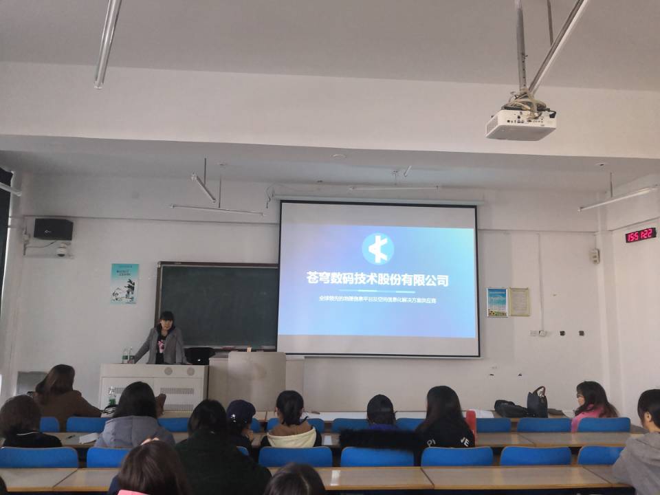 会上,袁玲老师介绍了苍穹数码技术股份有限公司基本情况,对公司多年来对学院学生工作的大力支持表示感谢,同时也希望同学们能够借此机会参与到第三次全国土地调查中来,提高操作能力、巩固理论知识。北京苍穹数码技术股份有限公司沈阳分公司主管刘海燕为同学讲述了公司简介、业务范围、基础平台等内容并着重介绍了公司在第三次全国土地调查中的任务,,并就同学们所提出的疑问进行了解答。