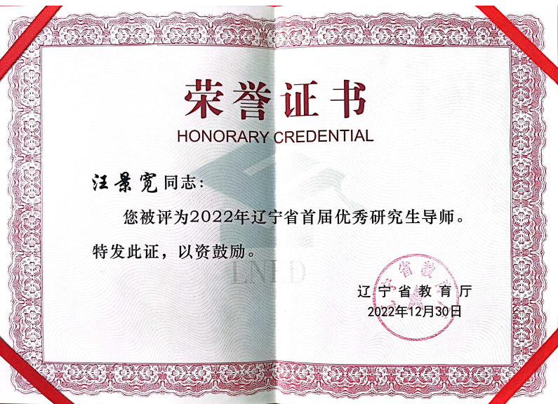 汪景宽教授成功入选优秀研究生导师。本次评选是辽宁省的首次,旨在鼓励和表扬全省在研究生教育工作中做出突出贡献的研究生指导教师和导师团队。