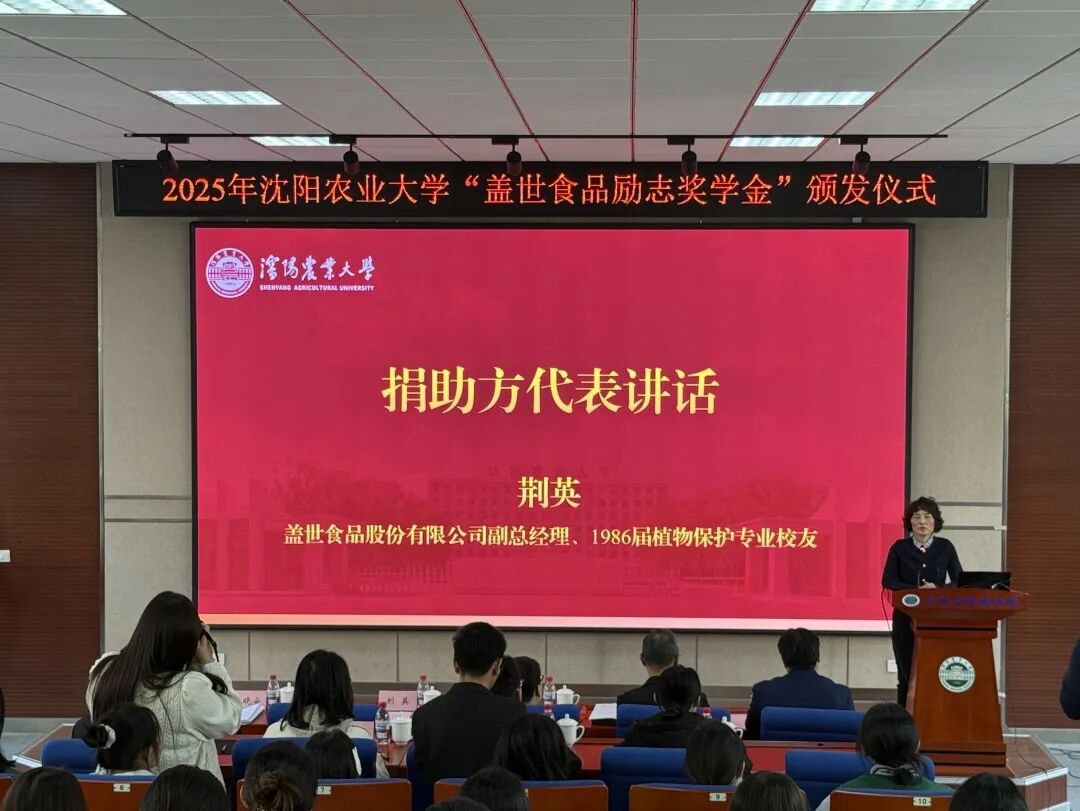 荆英代表公司为获奖学生颁发“盖世食品励志奖学金”证书并致辞。她亦是我校1986届植物保护专业校友,与盖泉泓为夫妇。她在讲话中深情回忆了当年与先生一同在沈农求学的岁月。那时,母校不仅给予了他们知识的滋养,也在生活上伸出了温暖的援手,让他们在求学路上感受到来自学校的关怀与力量。