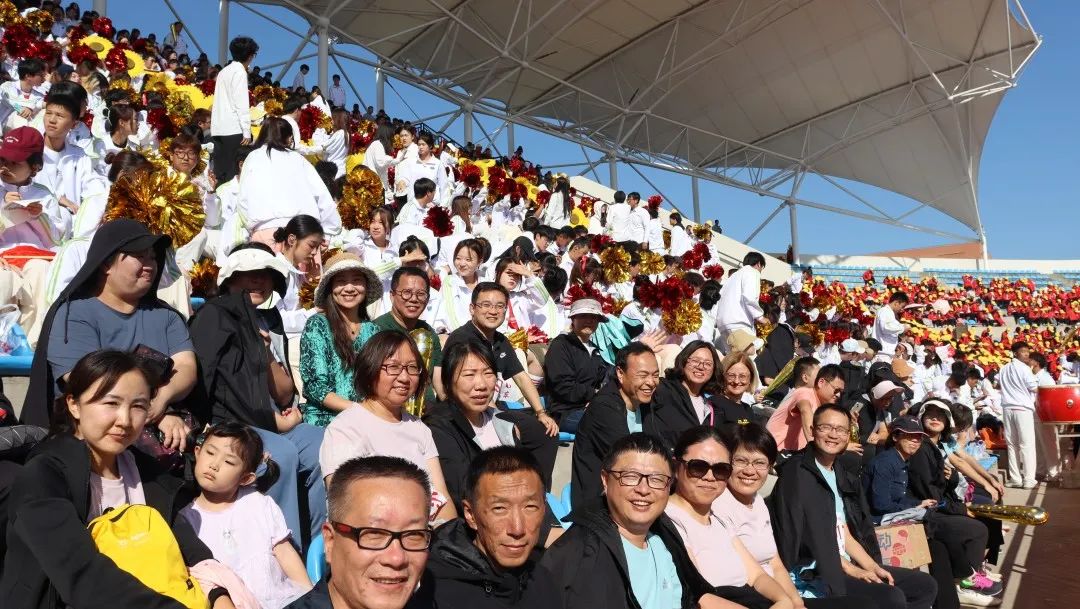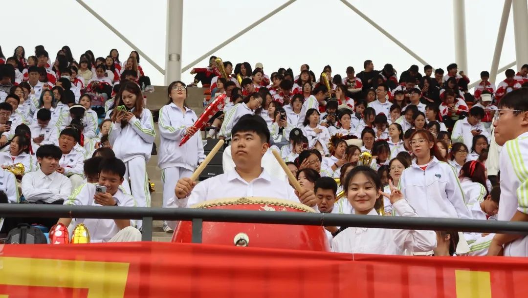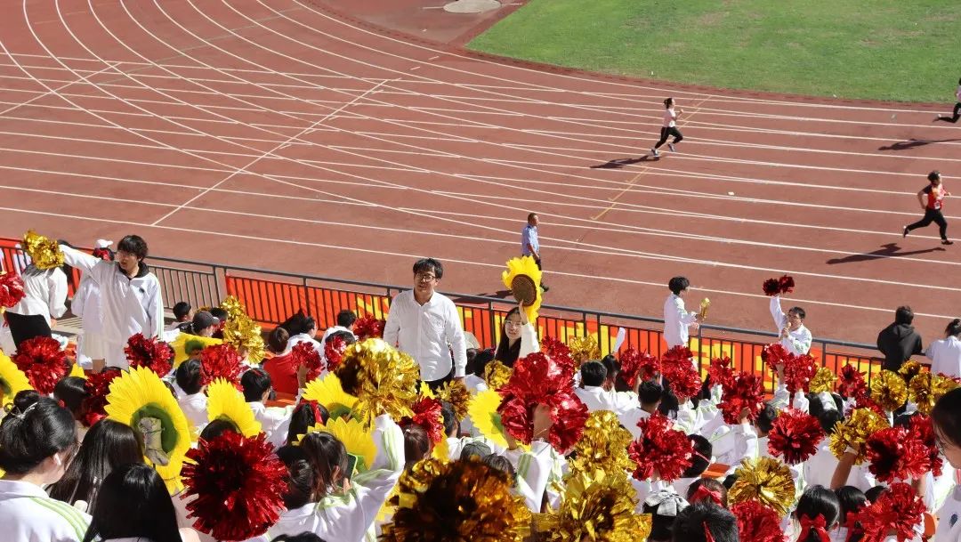 观众席上的老师、同学们,为运动员们呐喊助威。热烈的喝彩、舞动的花球,都表达出他们最真切的祝愿与期盼。