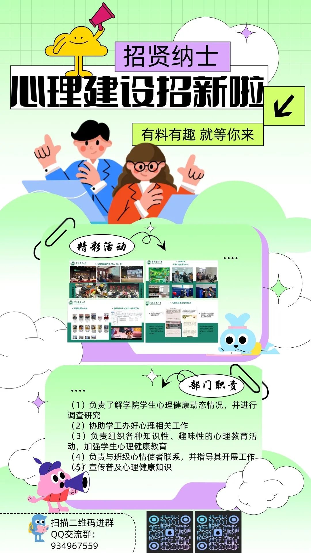 1. 负责学院本科生心理健康筛查相关工作,建立并完善学生的心理健康档案;