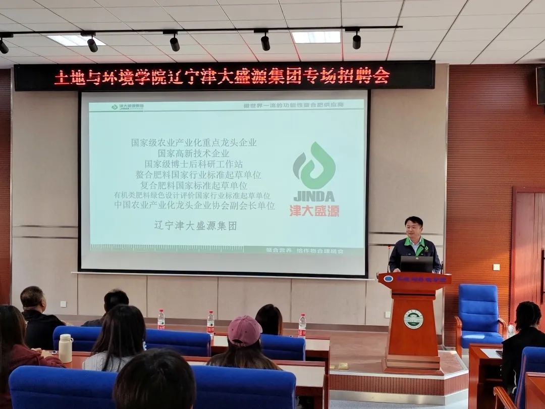 会上, 辽宁津大盛源集团营销公司总经理李哲吉通过集团荣誉、招聘职务、任职需求、工作职责、岗位福利、薪酬体系六大方面对集团进行介绍。