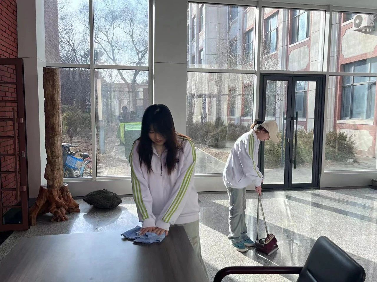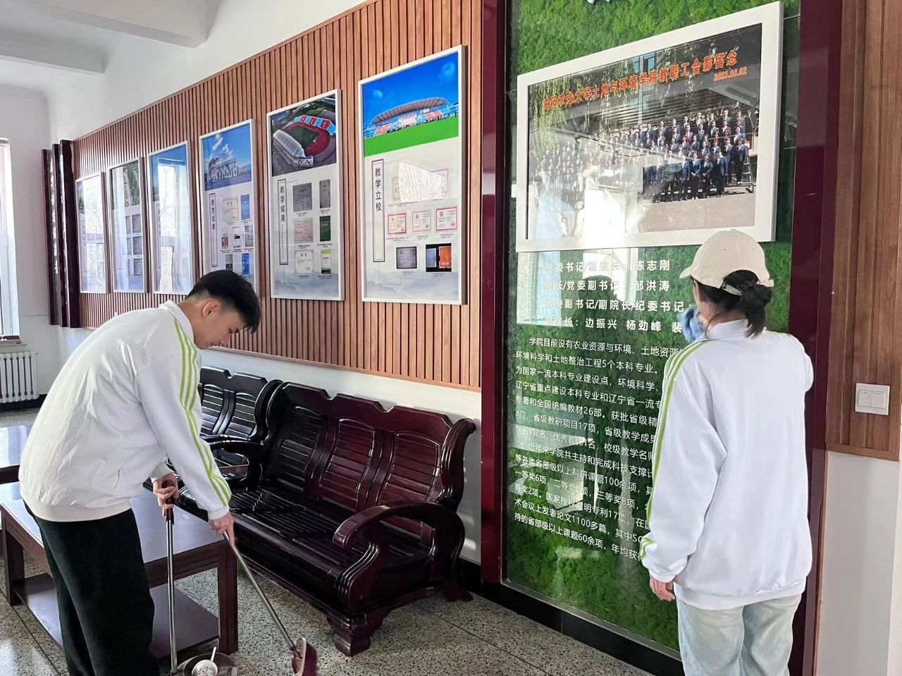 志愿者们手拿扫帚、铁锹等工具,在土壤楼清扫垃圾,用实践行动践行雷锋精神。