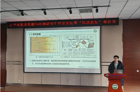 2024年12月18日,第十期辽宁省农业资源与环境研究生学术论坛暨“恩凤论坛”报告会在土壤楼A座226报告厅成功举行。本次论坛特邀土壤改良与农业节水团队的2022级博士生任立军进行学术汇报,报告题目为“不同施肥方式对设施土壤团聚体稳定性的机制研究”。王展副教授主持了本次报告会。