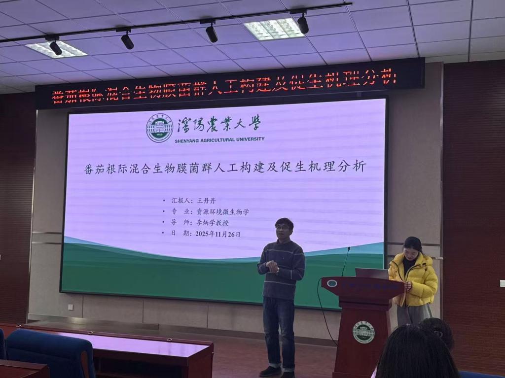 2025年11月26日,第十五期辽宁省农业资源与环境研究生学术论坛暨“恩凤论坛”报告会在土壤楼A座226报告厅成功举行。本次论坛特邀土壤生物与生物化学团队的2024级博士研究生王丹丹进行学术汇报,报告题目为“番茄根际混合生物膜菌群人工构建及促生机理分析”。由李炳学教授主持本次报告会。