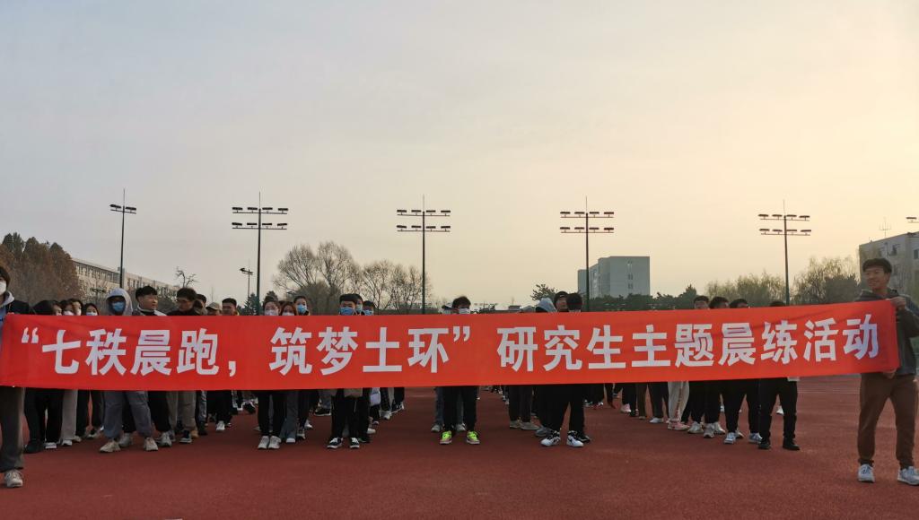 为纪念建校七十周年,疫情防控常态化下开展体育锻炼增强体质、磨炼意志品质, 11月9日早上在修复一新、干净靓丽的老操场,学院进行“七秩晨跑,筑梦土环”研究生主题晨跑启动仪式,学院党委书记陈志刚、研究生辅导员孙鑫、苏欣等老师及全体研究生参加了活动。