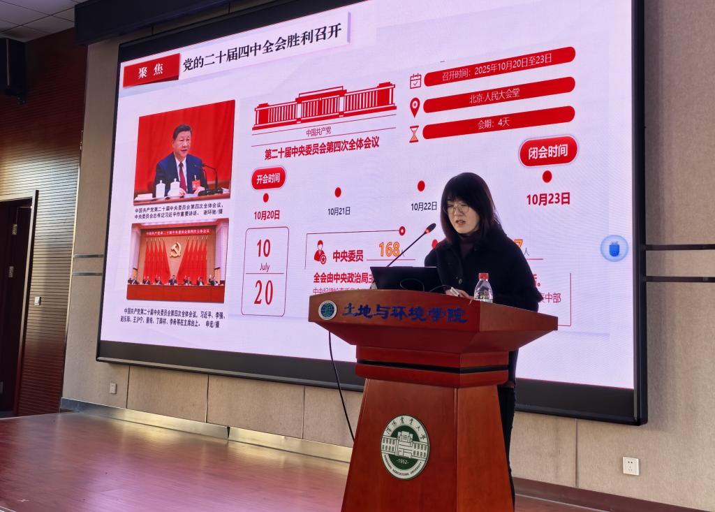 孙淑军教授从全会重大历史地位切入,系统解读“十五五”时期经济社会发展的指导思想、重大原则和核心目标。立足学院学科特色,重点解读全会关于“加快经济社会发展全面绿色转型,建设美丽中国”、“加快农业农村现代化、扎实推进乡村全面振兴”的战略要求,指出学院在国土空间规划优化、农业生态保护修复、乡村人居环境整治、耕地质量提升等领域的专业优势与国家战略需求高度契合,鼓励师生立足专业所长,将科研方向与乡村振兴实践、生态环境保护大局紧密结合,以科研成果赋能农业绿色发展和乡村全面振兴,用实际行动践行全会精神赋予的时代使命。